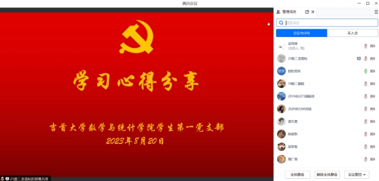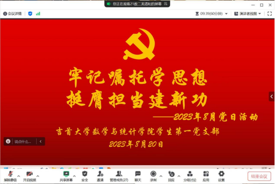 2023年8月20日13:00,伟德bv1946官网第一党支部在腾讯会议线上召开八月份主题党日活动。参与本次会议的有员工第一党支部书记张毓芯、以及本科生支部全体正式党员、预备党员。