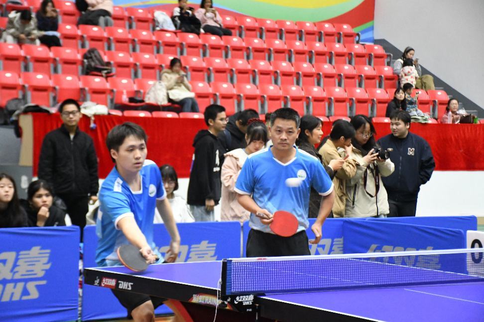 赛场上,师生选手们配合无间:发球弧线刁钻,扣杀势如破竹,攻防转换间尽显专业功底;面对胶着战局,他们沉着调整战术,每一分争夺都引得场边欢呼阵阵,既展现了“快、准、狠”的竞技水准,也诠释了“师生并肩、乐在乒中”的体育氛围。