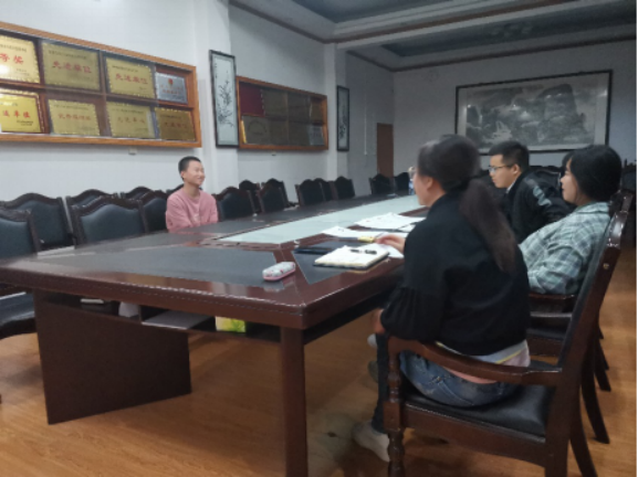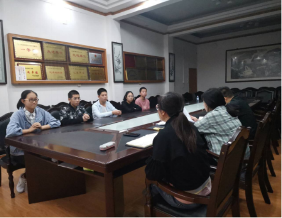 会议流程为班级认定小组推荐一名贫困认定员工,吴书记,丁老师和欧发勋助理进行面试,员工发言后,老师们根据员工的实际情况进行商讨,最终确定精进助学金推荐人为彭丽红和杨东鋅。