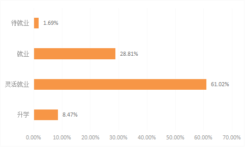 公司2017届本科毕业生传统就业占18.80%,灵活就业占68.42%,继续深造与出国占11.28%,待就业占1.50%。详见图1.4.1。