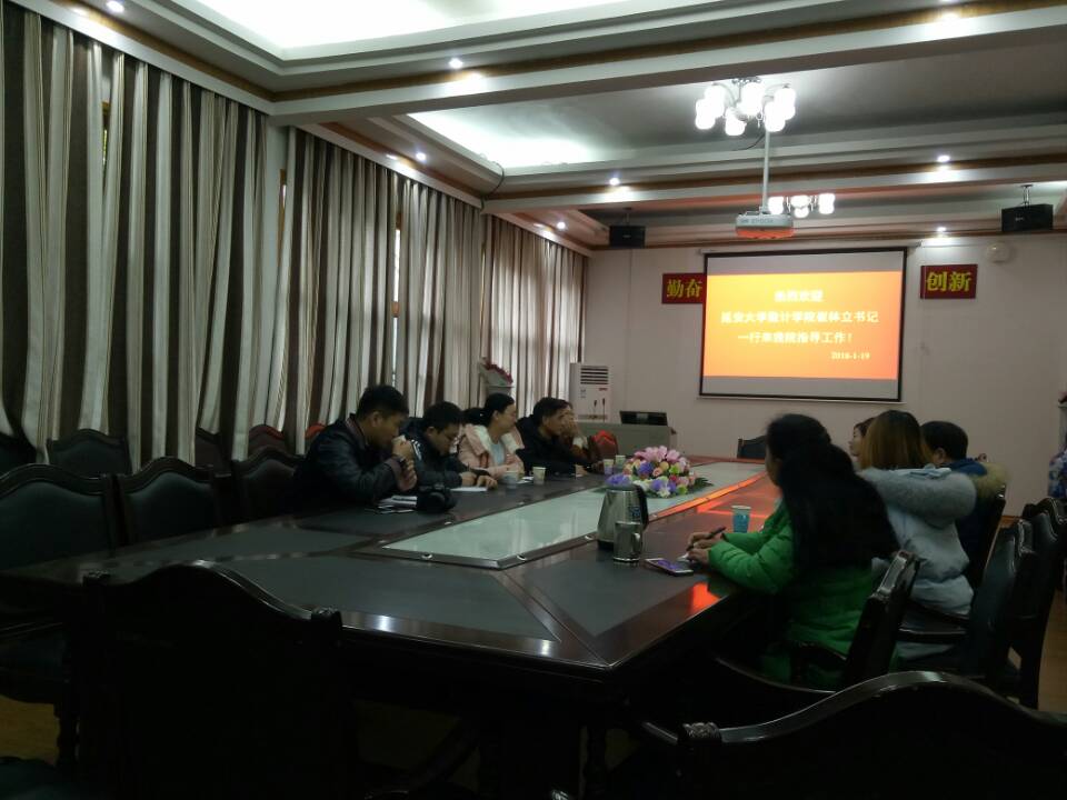 本网讯(通讯员 颜超)2018年1月19日,延安大学数计公司公司党委副书记崔林立、学工办主任高媛媛、团委书记刘瑶、党委秘书韩浩亮与学工办老师马涛一行来公司交流创新创业工作经验。公司党委副书记吴丽华、院办公室主任陈玲、创新创业工作室主任彭立平,学工办陈辉、丁玉兰热情接待了崔林立一行。