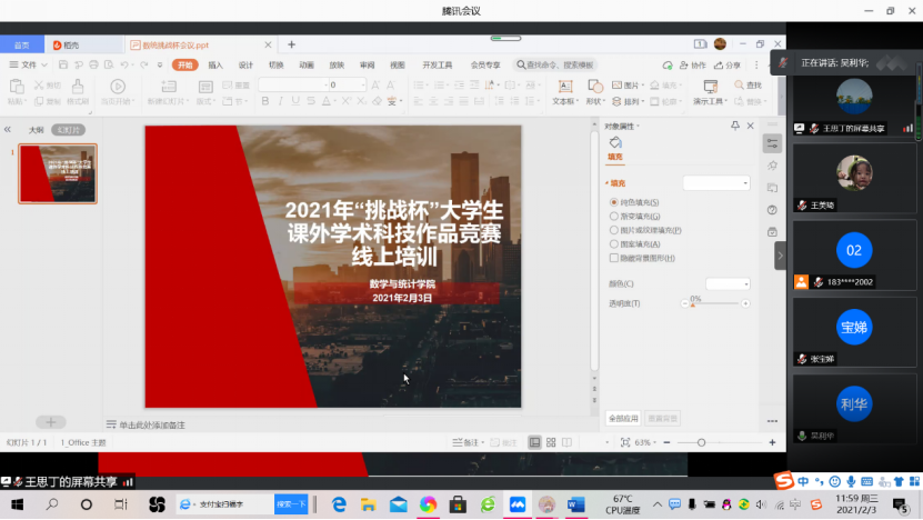 本网讯(通讯员 王美琦 谭雅铭)为进一步引导员工培养科学精神、科学态度,提高老员工的科学研究能力,增加员工和指导老师对“挑战杯”的认识与理解。2021年2月3日上午9:00-11:00数学与统计学院于腾讯会议成功进行“挑战杯”专题培训与讲解。校团委办公室主任张宝娣,伟德bv1946官网副经理欧祖军,公司党委副书记吴利华,指导老师和员工累计73人参与本次会议,本次会议由丁玉兰主持。