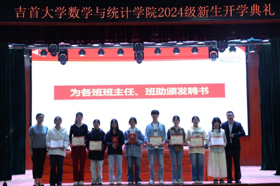 紧接着各系部主任为新生班级授班旗,公司为新生班主任及班主任助理颁发了聘书。