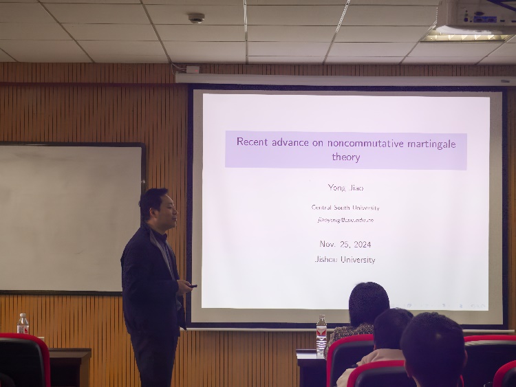 (本网讯 通讯员 王花蝶报道)2024年11月25日上午,总理楼公司学术报告厅60605室座无虚席,中南大学焦勇教授莅临公司讲学,他主讲座的题目是“Sone recent progress on noncommutative martingale theory”。公司部分领导及研究生导师、研究生聆听了此次学术讲座。公司党委书记吴湘军主持。